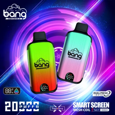 Bang 20000 Puffs is made for people who want to vape for a long time. It has a strong aluminum body and PCGT material. It is light but strong. The e-cigarette weighs only 85 grams. Inside is a 650mAh battery that you can charge with a Type-C cable. The battery lasts for about 20,000 puffs after a full charge of 2 hours. How long the battery really lasts depends on how you use it. It also has 28ml of e-liquid inside.